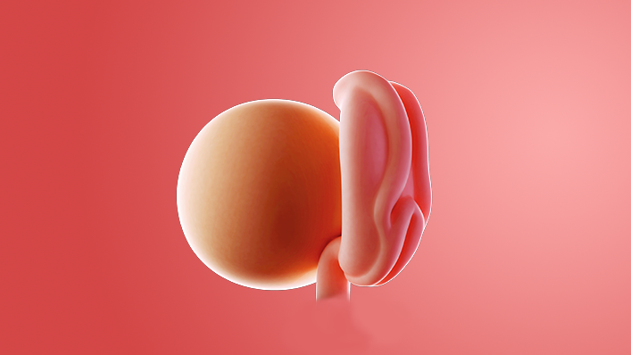 The face is starting to take shape, with a tiny nose and little eyes, which stay closed until around 28 weeks. Your baby's brain and spinal cord are forming rapidly inside you.
