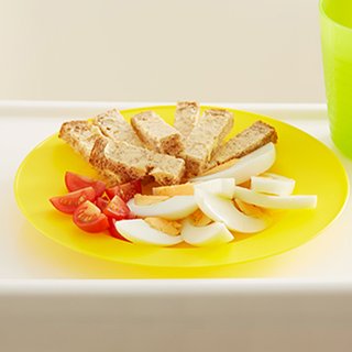 Serve the toast, egg fingers and tomatoes on a plate – encourage your baby to feed themselves.