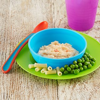7. Blend or mash the cooked dish until it is smooth with soft lumps, reserving some pasta for a finger food. Serve with the peas on the side.