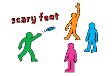 2. The person with the Frisbee says someone's name and throws it to them. As they throw it, they shout out a move like "Scary feet!".